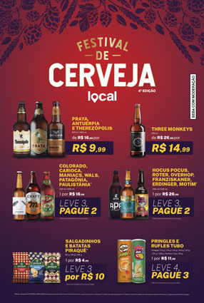 Os clientes ainda podem encontrar descontos especiais do Festival de Cerveja da Local nos rótulos de Three Monkeys (500ml), de R$26,99 por R$14,99 e Trela (500ml) de R$16,99 por apenas R$8,49. As cervejas Antuérpia (500ml), Praya (600ml) e Threzópolis (500ml) também entram nas ofertas do Festival, saindo de R$16,99 por R$9,99.