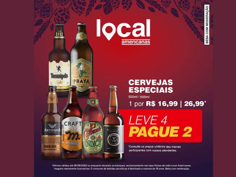 A Local também ter ofertas de Leve 4 Pague 2 para Cervejas Especiais de R$ 16,99 Colorado, Patagonia, Antuerpia, Praya, Therezopolis, Maniacs, Wals, Paulistania e 3 Cariocas – e de R$ 26,99 – Hocus Pocus, Overhop, Three Monkeys, Roter, Franziskaner, Erdinger e Motim.