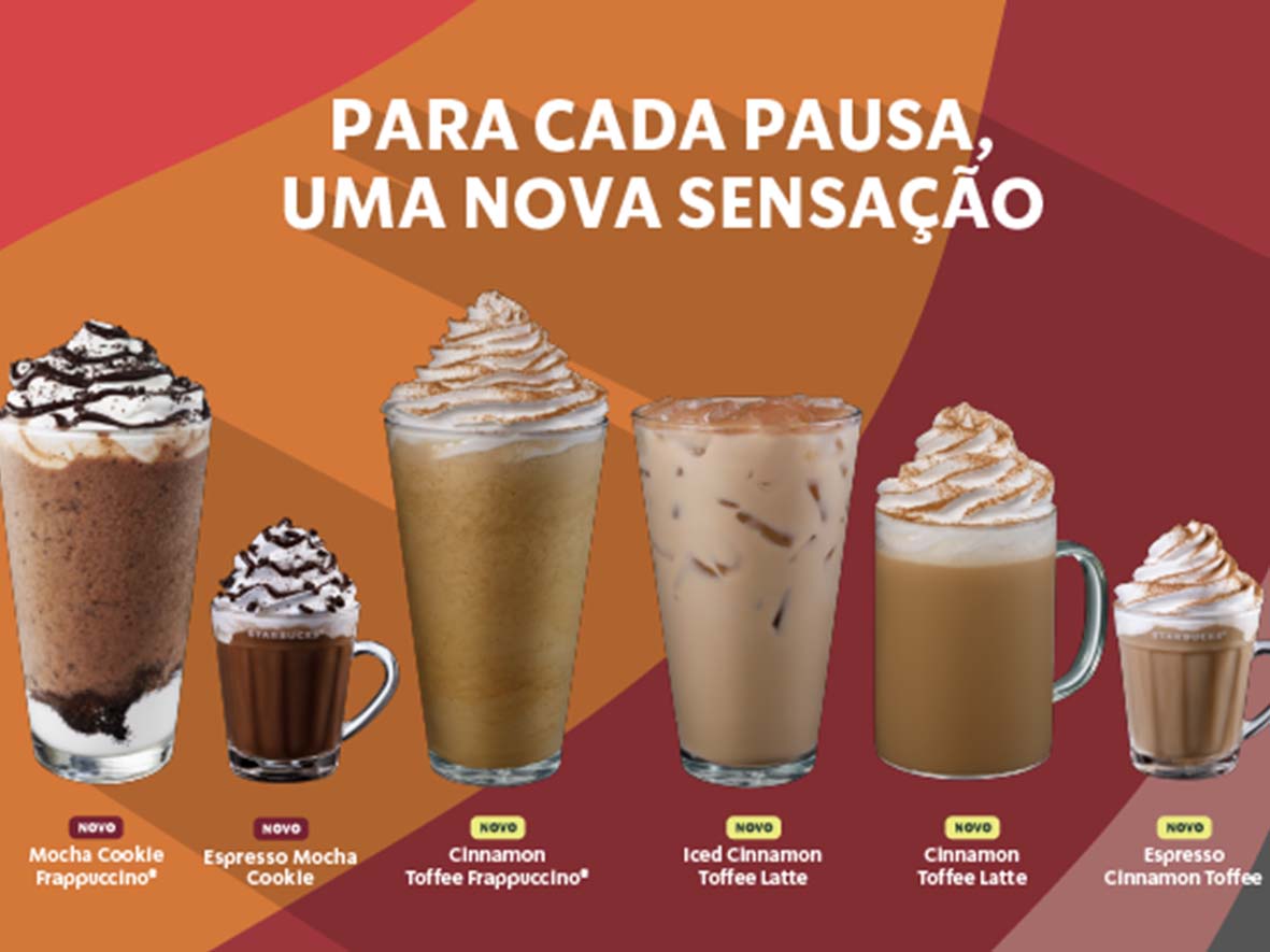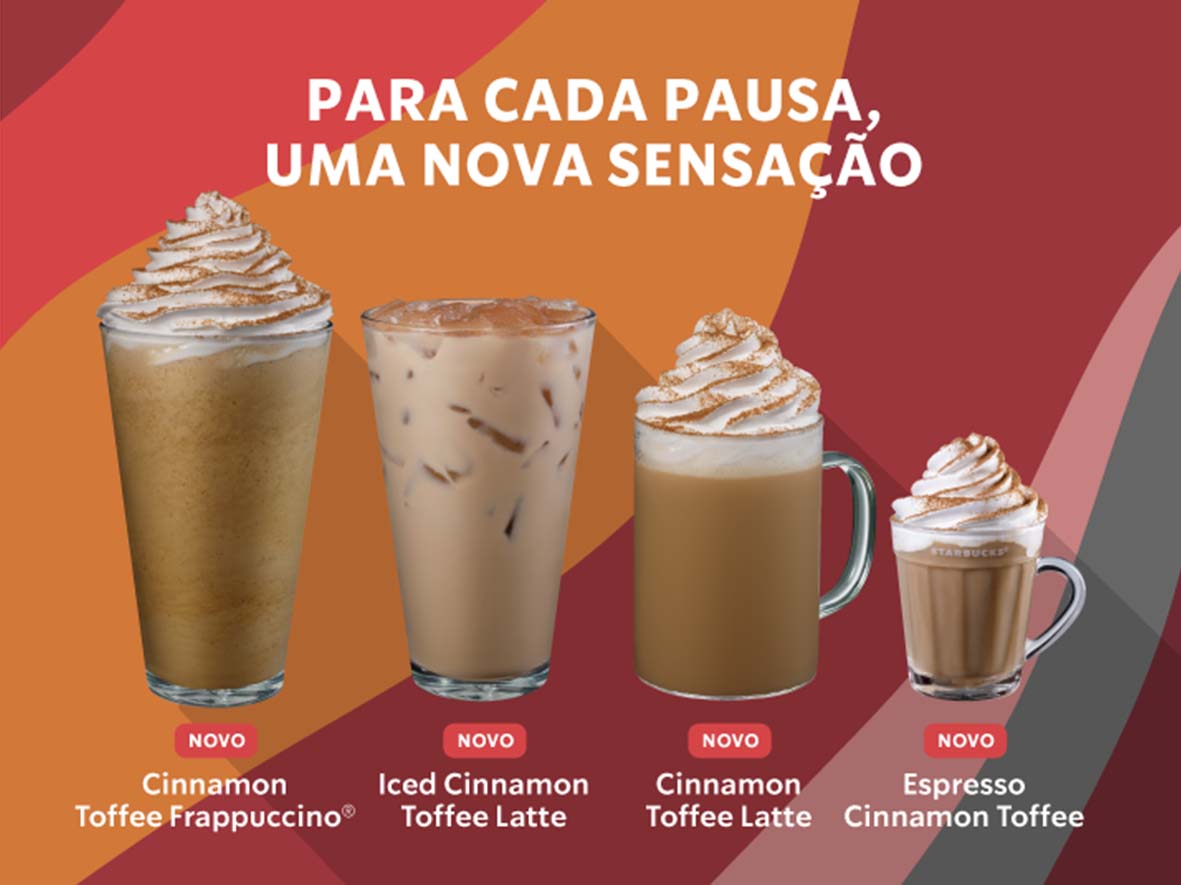 A linha Starbucks® Cinnamon Toffee traz a canela e o sabor das castanhas caramelizadas. A coleção tem o Latte, Iced (com Cold Foam) e Frappuccino® – a partir de R$ 17,00 – e Espresso, a partir de R$ 10,50.