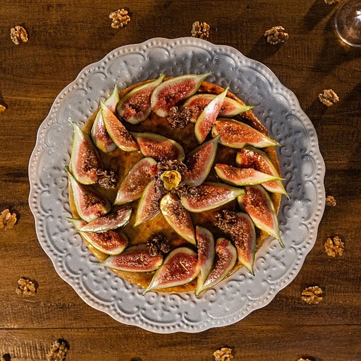 – Manjar de Coco cremoso com calda de ameixas flambadas em Amarula .
