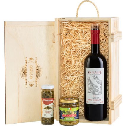 – Kit Para Presentear com Ziobaffa: bruschetta, alcaparras e o vinho italiano Ziobaffa em uma caixa de madeira.