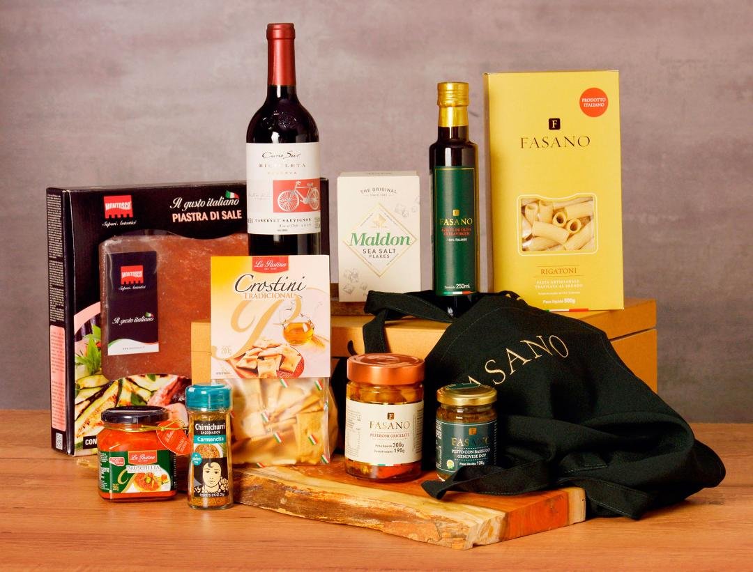 – Kit Pai Chef Fasano: azeite extra virgem Fasano, pimentão na brasa Fasano, macarrão rigatoni Fasano, molho pesto genovês DOP Fasano e avental Fasano, na caixa de madeira. Preço: R$ 199,90.