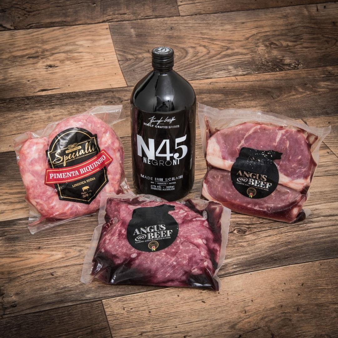 O Kit 1 tem 1 N45 + Denver steak 600g + chorizo 600g + linguiça artesanal 500g, no valor de R$ 280,00. O Kit 2 traz 1 N45 + Denver 600g + chorizo 600g + ancho 600g + linguiça artesanal 500g + sal de parrilla e custa R$ 350,00.