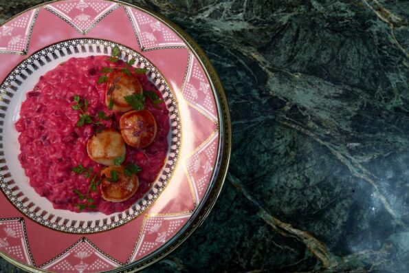 – Prato principal: risotto rosa (R$ 98,00) com beterraba orgânica e vieiras canadenses;