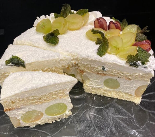 Distribua 20 unidades de uvas inteiras sobre o recheio. Aperte as uvas levemente para afundá-las. Coloque novamente 1/3 do recheio de cream cheese. Coloque o segundo disco de pão de ló.