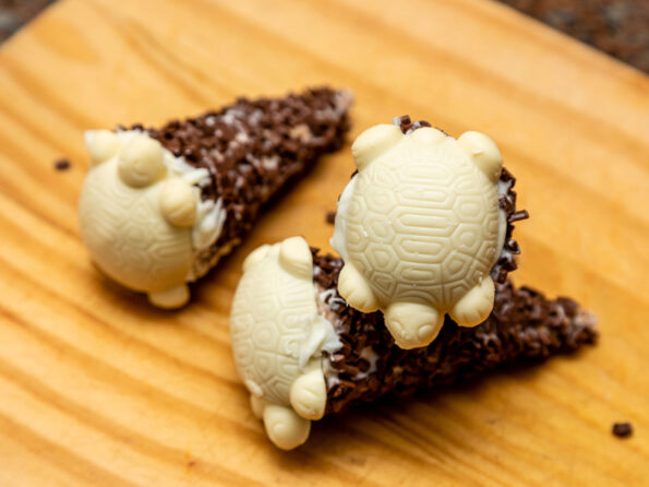 Encha as casquinhas de sorvete e tire o excesso. Coloque uma tartaruga de chocolate por cima.