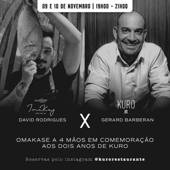O Kuro Restaurante, em São Paulo, completa dois anos de sua criação com um evento especial: um jantar a quatro mãos com o chef David Rodrigues, do Imakay, nos dias 9 e 10 de novembro.