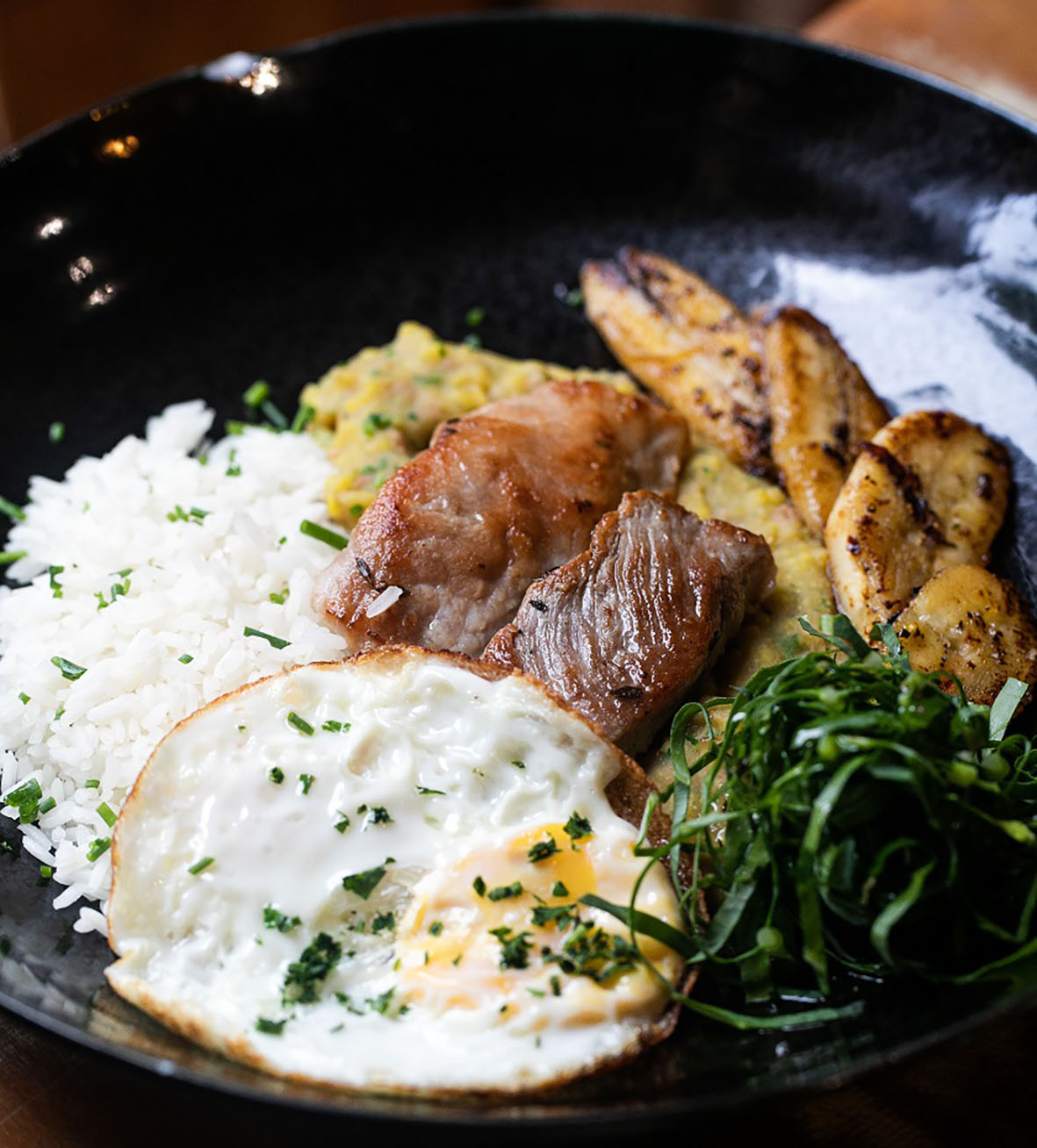 – Virado à Paulista com bisteca, linguiça, arroz, tutu, banana, ovo frito e saladinha de couve;