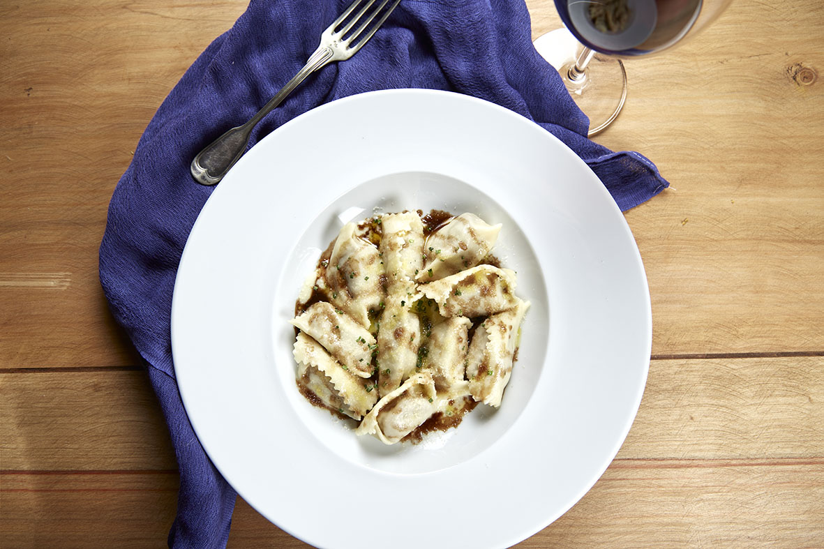 – Ravioli di Brasato Al Vino Rosso: massa branca recheada com carne assada lentamente no Cabernet, servida com creme de queijo e molho do assado.