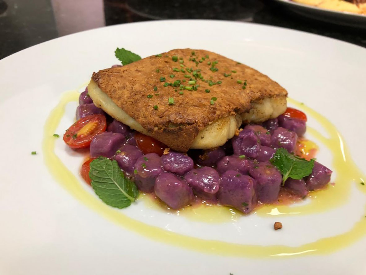 – Robalo: robalo em crosta de castanhas com nhoque de batata roa e manteiga de
