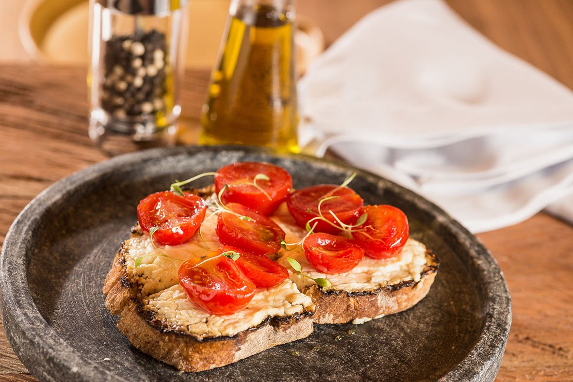 – Bruschetta clássica: pão de grãos, tomate picado e manjericão.