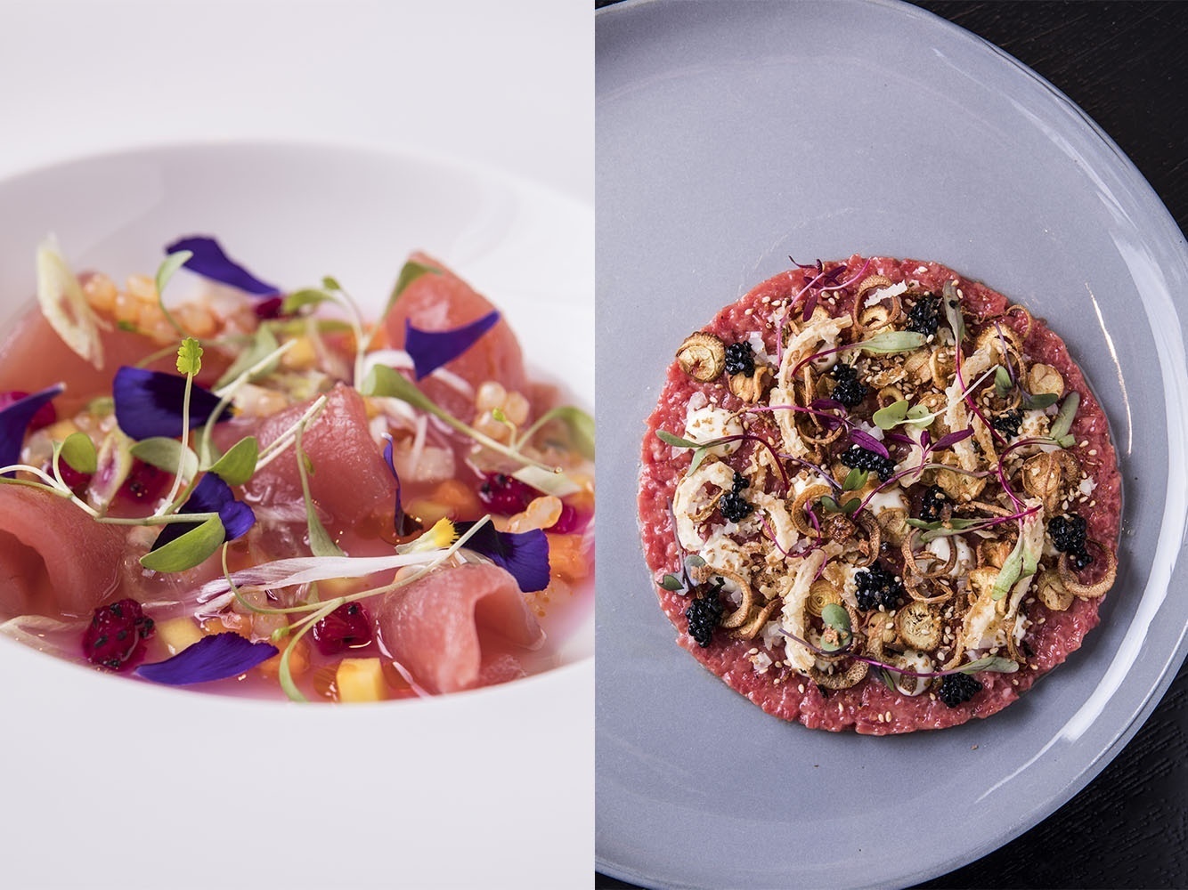 – Crudo de Atum com frutas tropicais e infusão de limão, coco e pérolas de tapioca com especiarias.