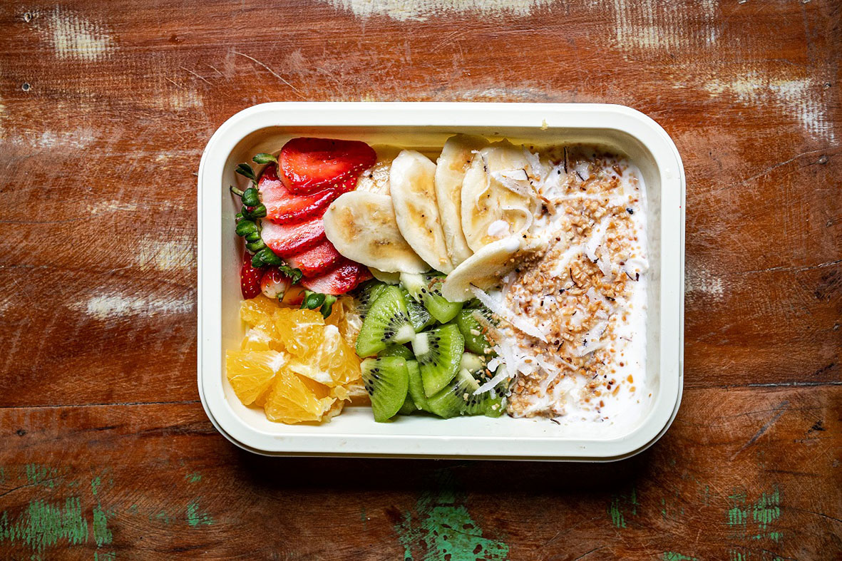 – Bowl de frutas da estação com iogurte, sementes e mel;