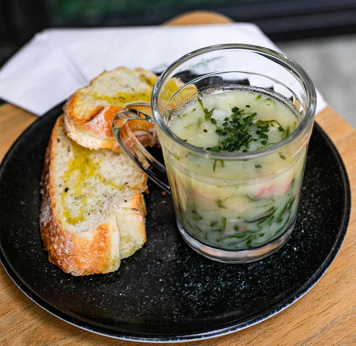 – Caldo Verde: linguiça calabresa, bacon, couve manteiga, batata asterix e gremolata, servido com pão português.