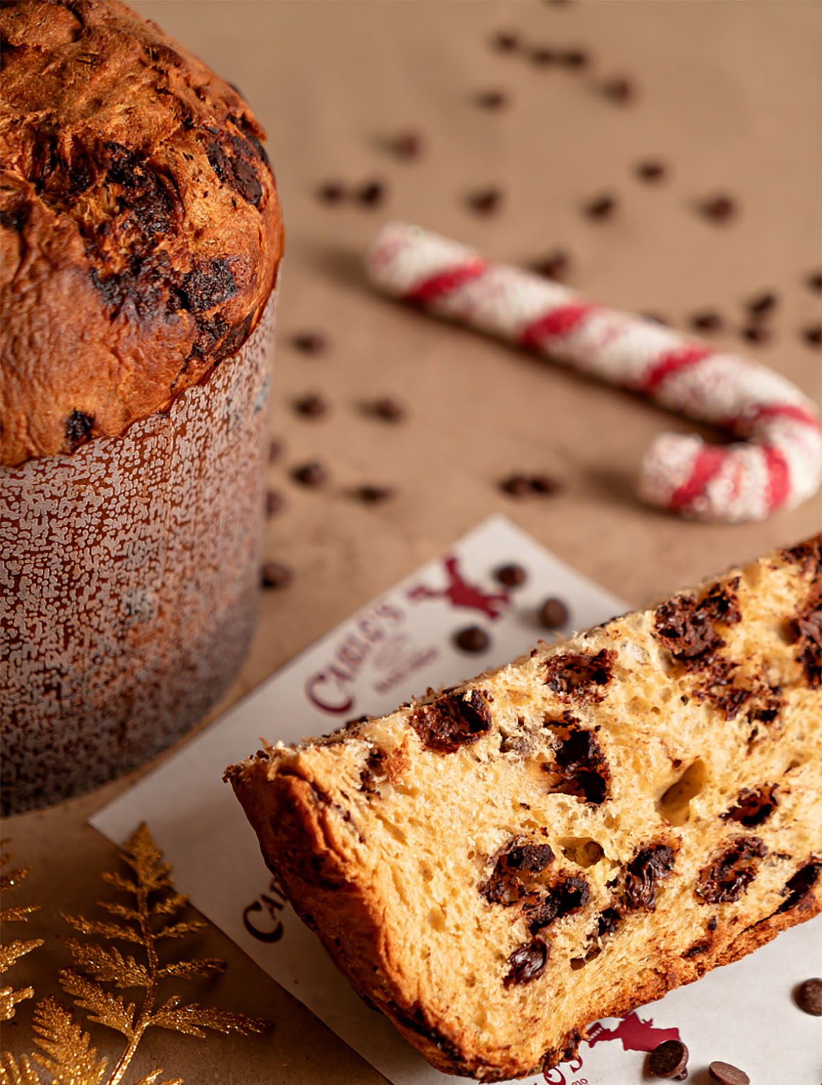 – Panetone recheado com creme gianduia, gotas de chocolate e cobertura de chocolate .