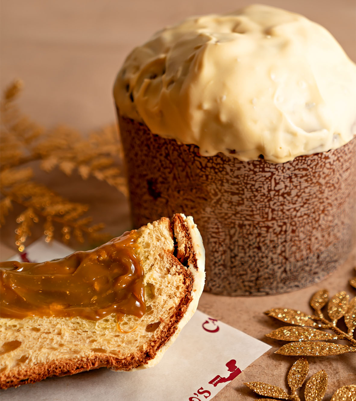 – Panetone com recheio de doce de leite e nozes: com cobertura de chocolate branco e crocante de nozes.
