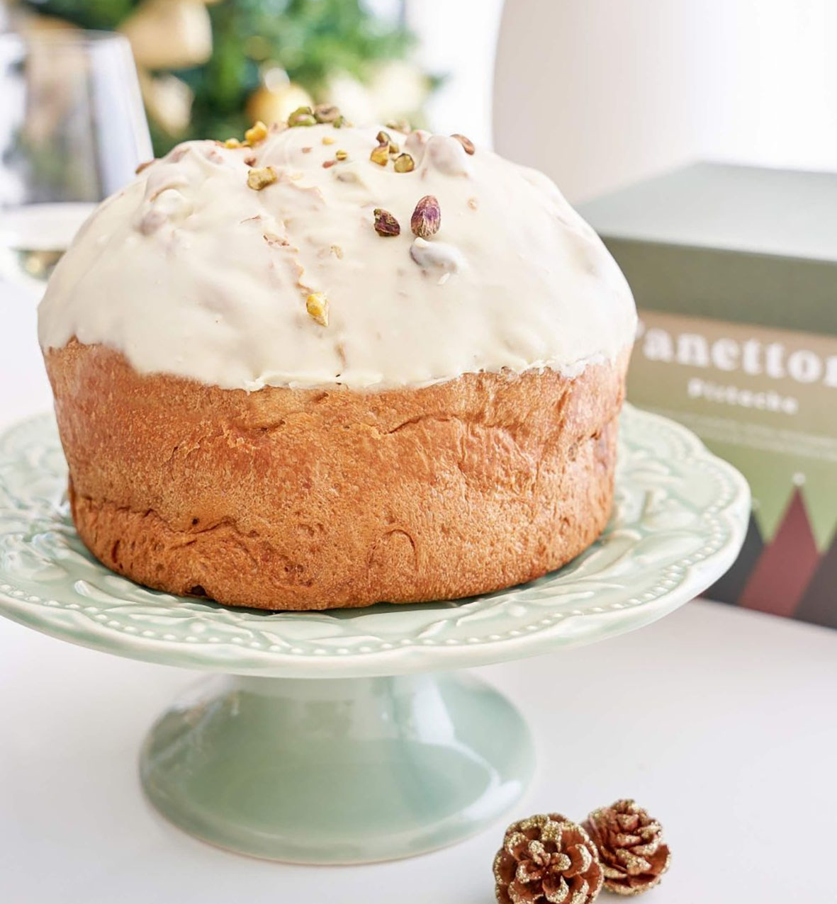 – Panetone de pistache com recheio de brigadeiro de pistache e cobertura de chocolate branco belga (1kg).