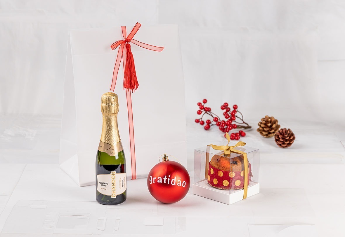 – Mimo: um mini Chocotone amarrado com uma fita, uma Baby Chandon, uma Bola de Natal, saco vegetal com Tag e Pingente. Inclui uma playlist. Preço por pessoa: R$ 168,00 (+ valor do frete).