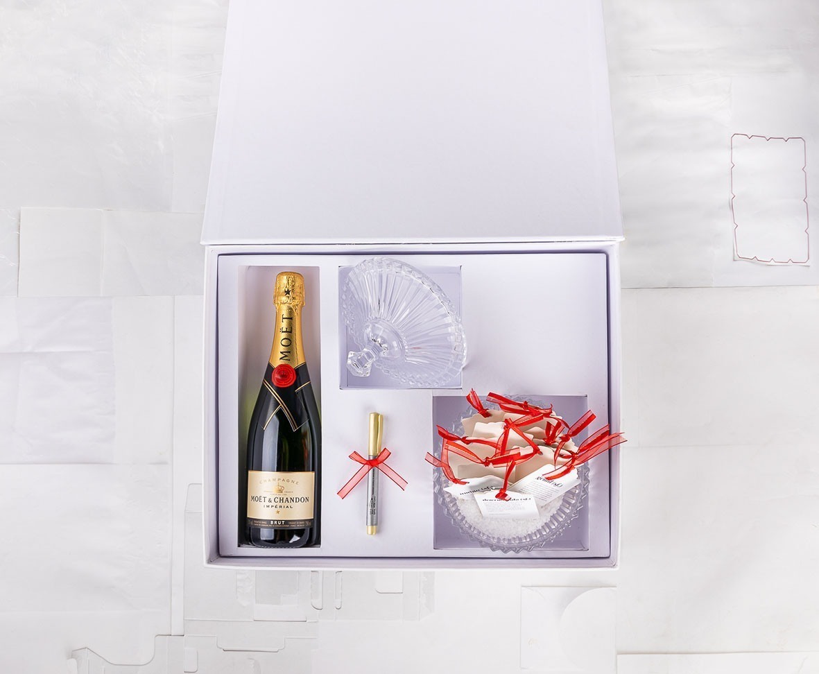 – Abraços: uma bombonière de vidro, 20 cards impressos uma caneta dourada e uma caixa com textura de couro; uma Chandon ou uma Moet Chandon. Inclui playlist. Preço: R$ 530,00 (+ valor do frete) ou R$ 880,00 com Moet Chandon (+ valor do frete).