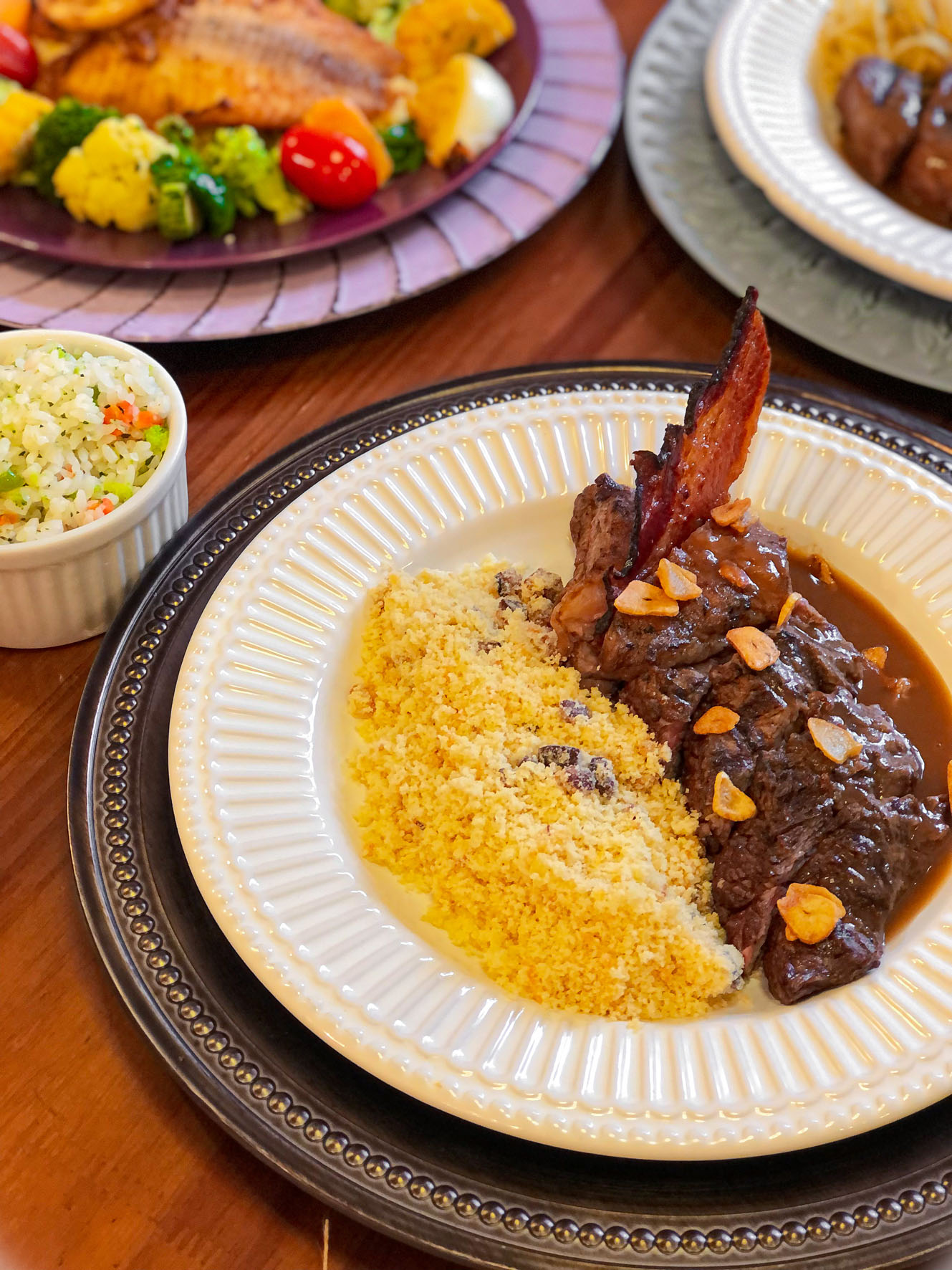 – Fraldinha Grelhada ao molho roti, arroz primavera, lascas de alho com bacon e farofa da casa (R$ 55,00).