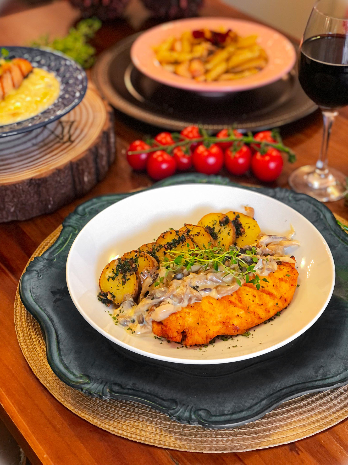 – Filé de Frango Grelhado ao molho de cogumelos com batatas provençal e arroz branco (R$ 45,00).