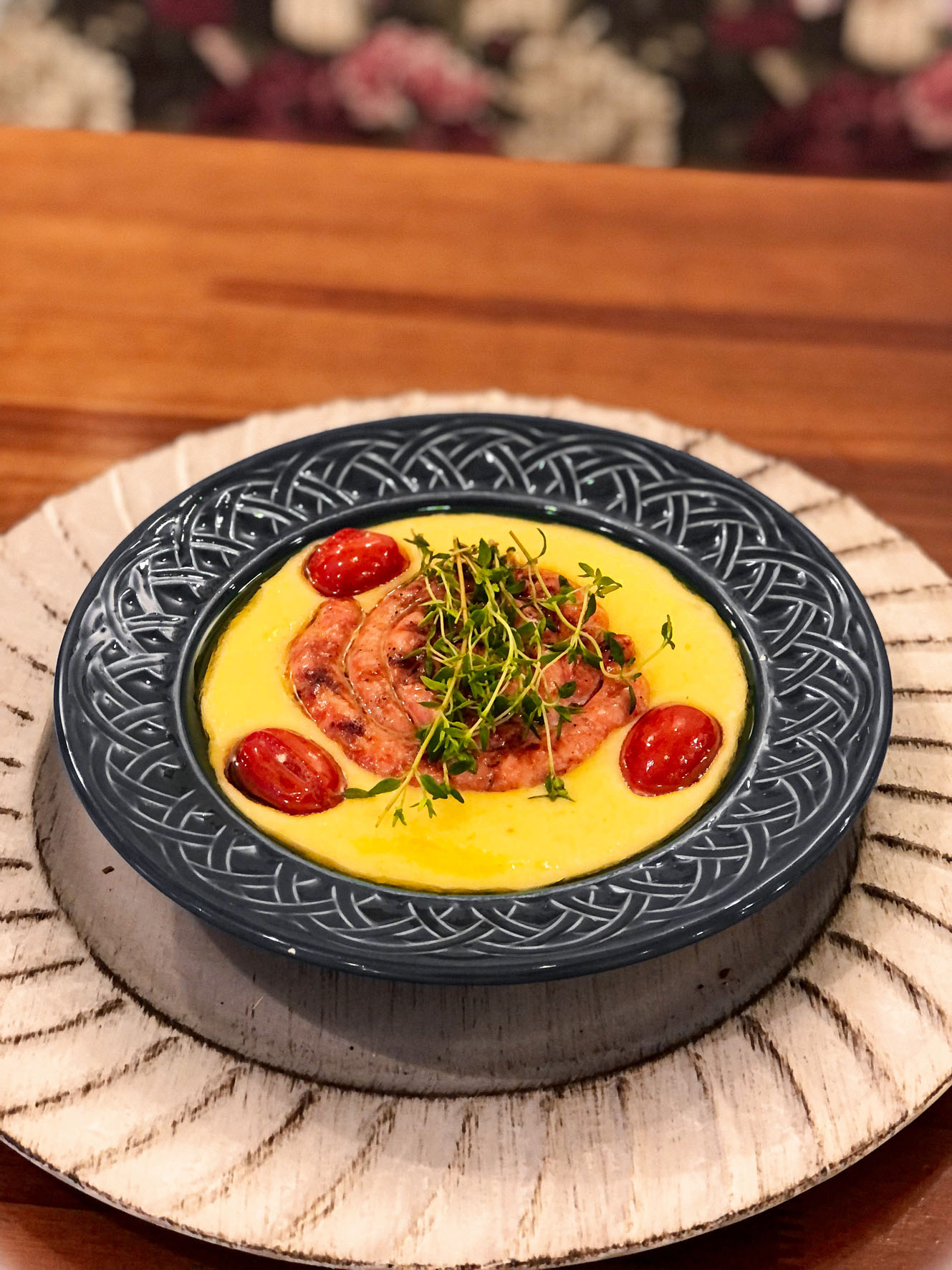 – Polenta Cremosa com tomates confit, pétalas de cebola e linguiça de rolo.