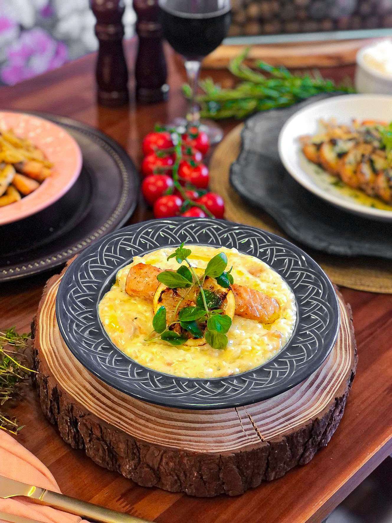 – Risoto Salmão Flambado com limão siciliano grelhado (R$ 75,00).