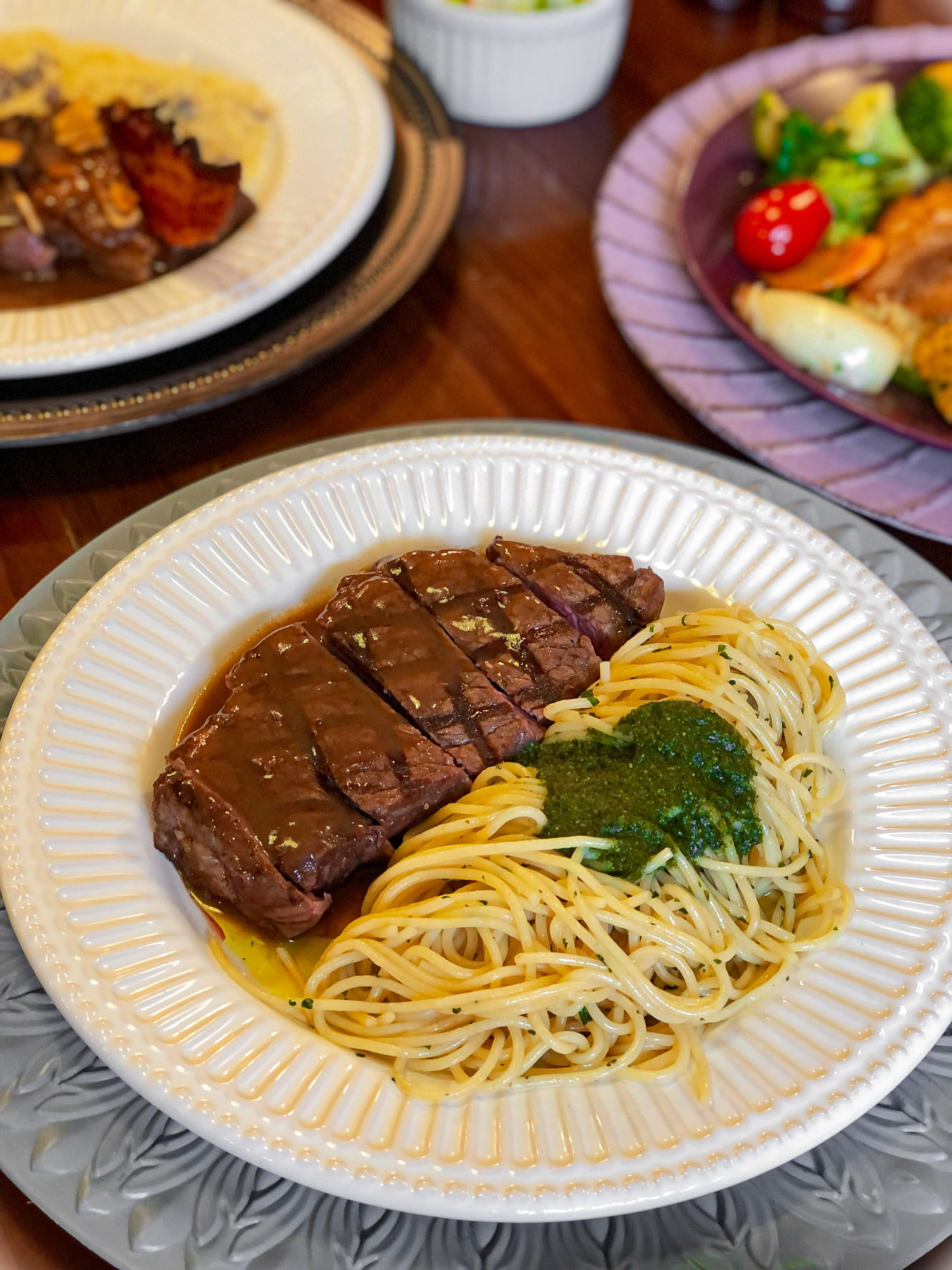 – Steak Bovino ao molho demi-glace com spaghetti salteado na manteiga, lascas de alho e pesto de basílico.