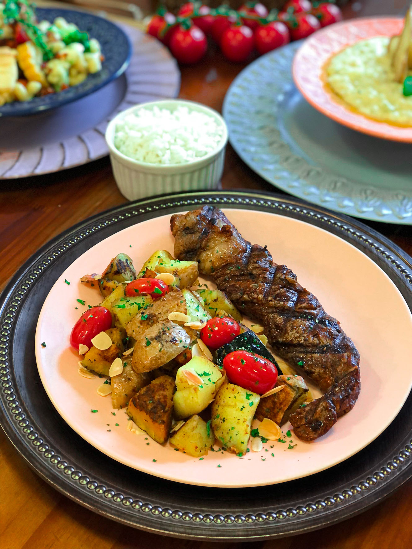 – Steak Bovino Grelhado na manteiga de ervas, abóbora cabotiá, batata dourada e batata doce no azeite de amêndoas e arroz branco (R$ 69,00).