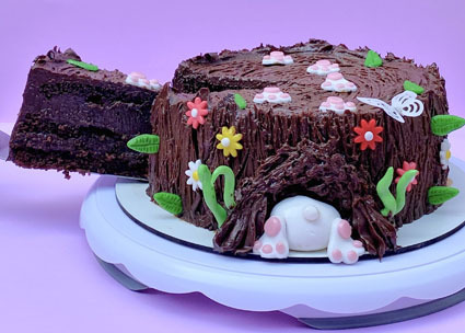 – Torta Encantada (R$ 220,00 – serve de 12 a 16 fatias): bolo de chocolate, duas camadas de brigadeiro, coberto com ganache e finalizado com flores e patinhas de coelho (feitos de pasta americana).