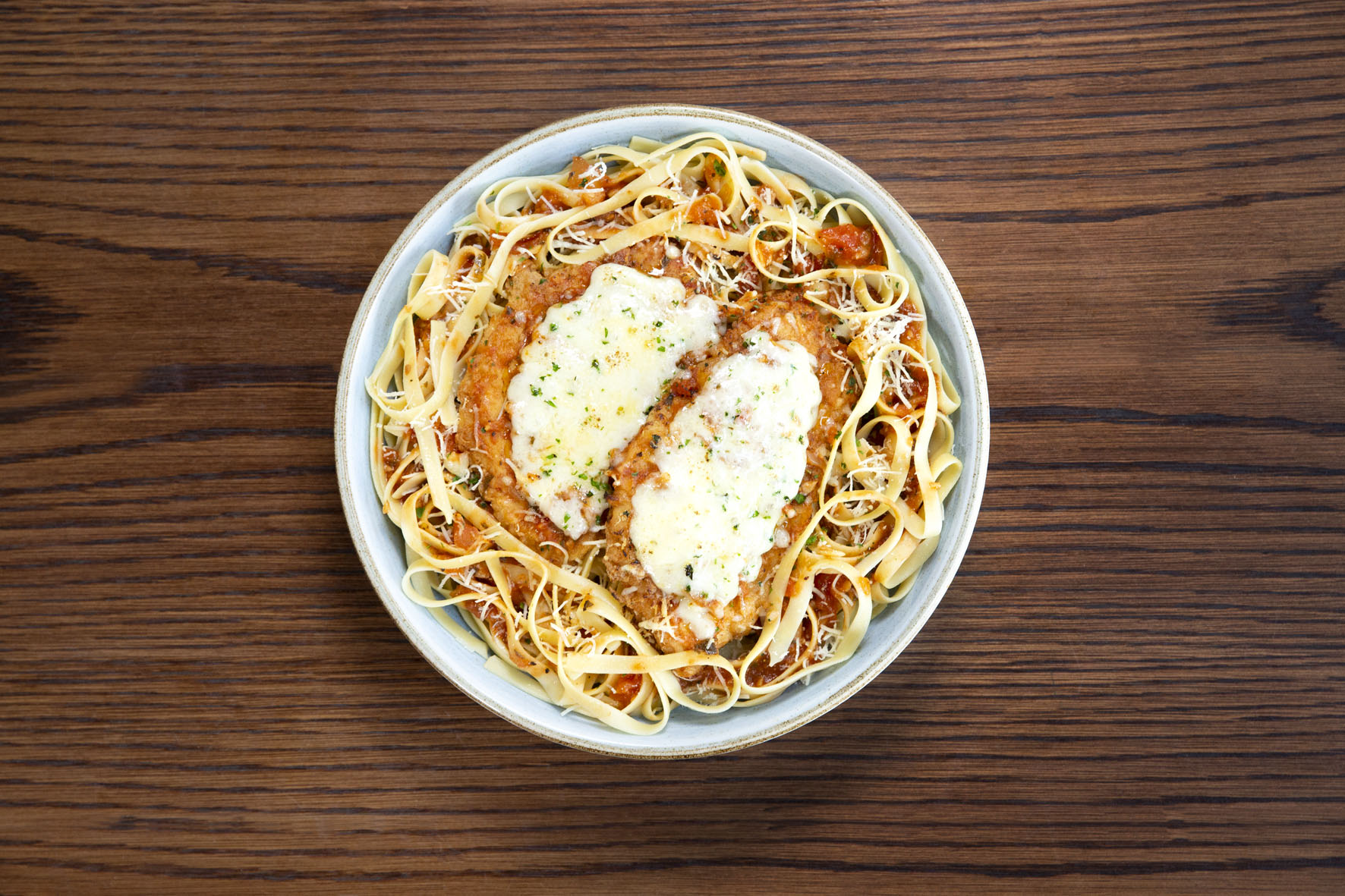 – Chicken Parmesan: dois peitos de frango empanados em massa especial com queijo parmesão, salteados e servidos sobre fettuccine com molho marinara.