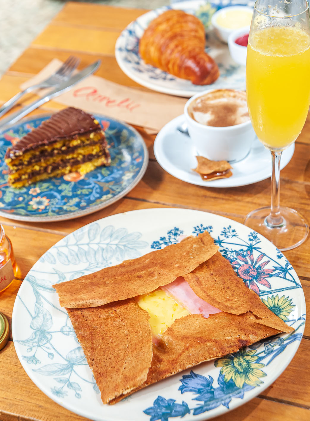 Outra opção traz os pratos principais, como o croissant com acompanhamento (Nutella, doce de leite ou geleia, por R$ 20,00), omelete com cogumelo Paris ou queijo de cabra (R$ 22,00), mini galette de queijo ementhal com presunto (R$ 24,00), entre outros itens.