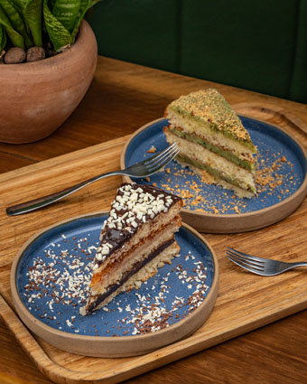 – Bolos: Pistache (R$ 22,90) e o Duo Chocolate (R$ 17,90), com uma camada de chocolate branco e outra preto.