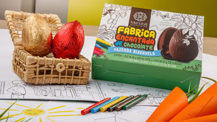 – Kit Fábrica Encantada de Chocolate (R$ 85,00 – 120g): um ovo 40% cacau ao leite e um ovo 70% cacau, livro para colorir e caixa de giz de cera.