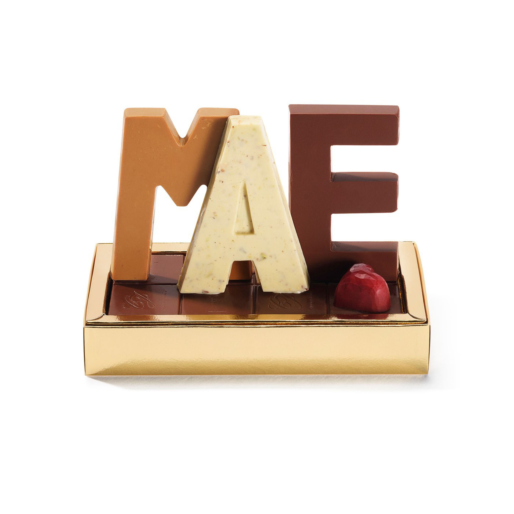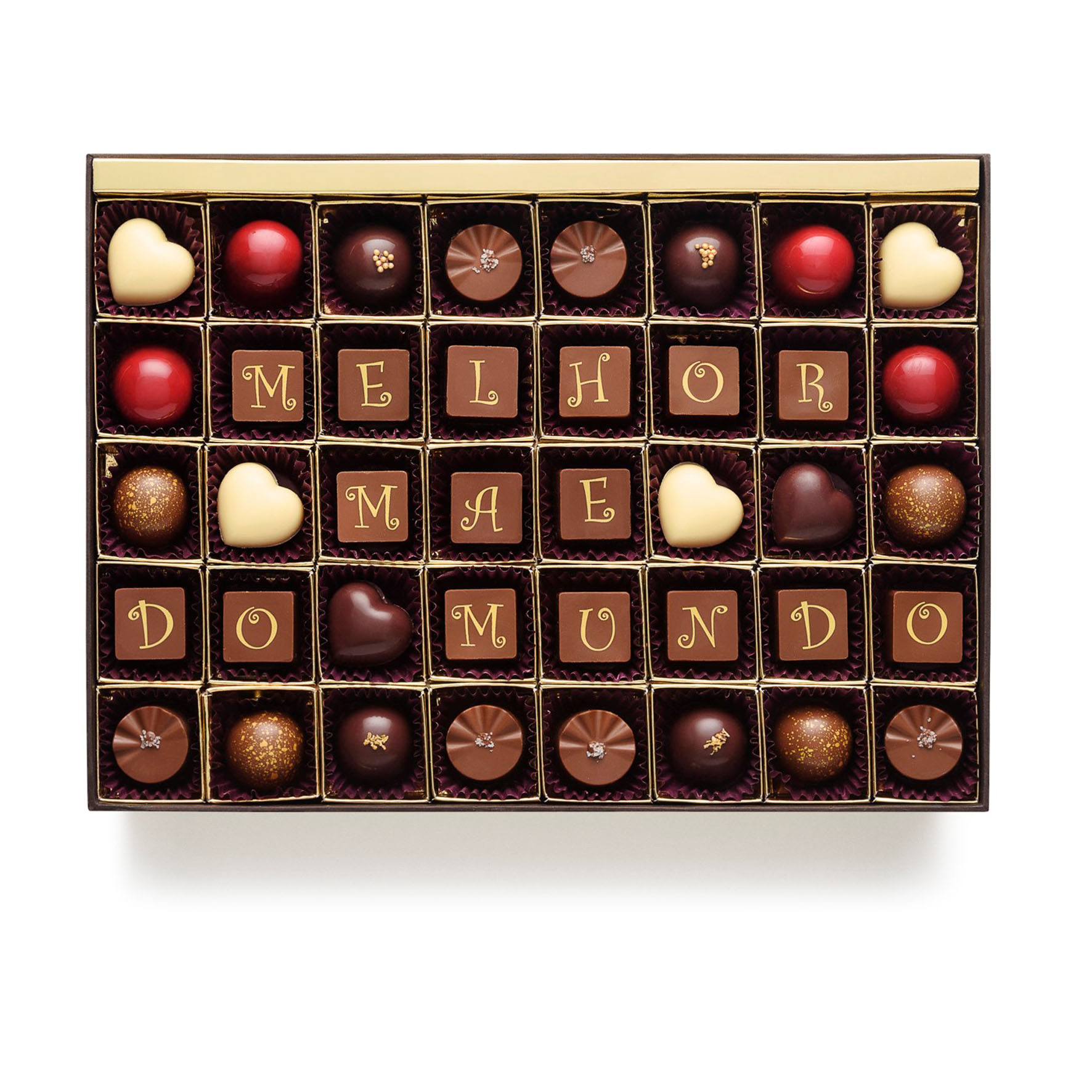 – Letras MÃE (R$ 225,00): barra de chocolate ao leite bean to bar (45% cacau), com as letras nos sabores Pistache, Brullê, Ao Leite. Acompanha um bombom Cerise.