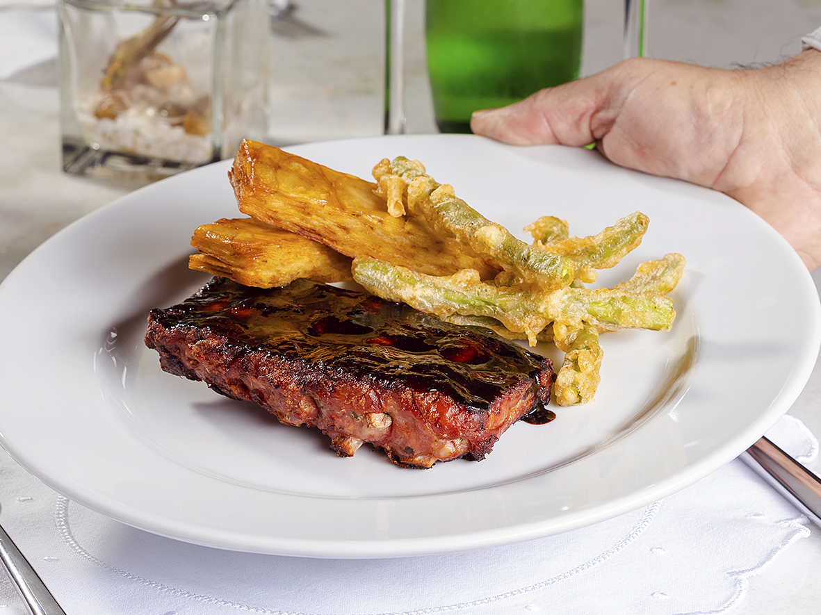 – Ou costelinha suína ao ponzu, acompanhada de gratin de batata e tempura de vagem.