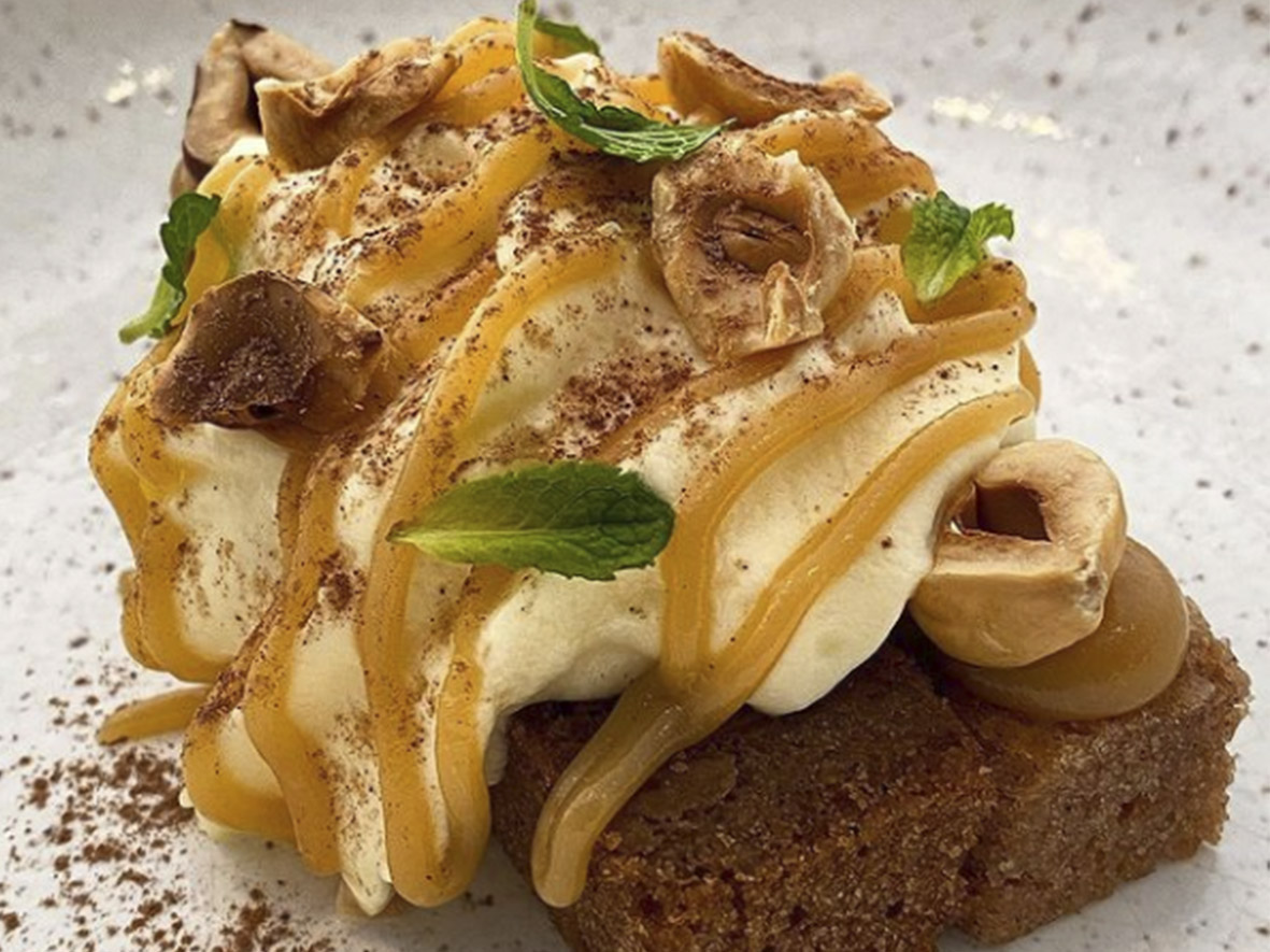 – Pão de especiarias, chocolate amargo, espuma de mel, caramelo e avelã.