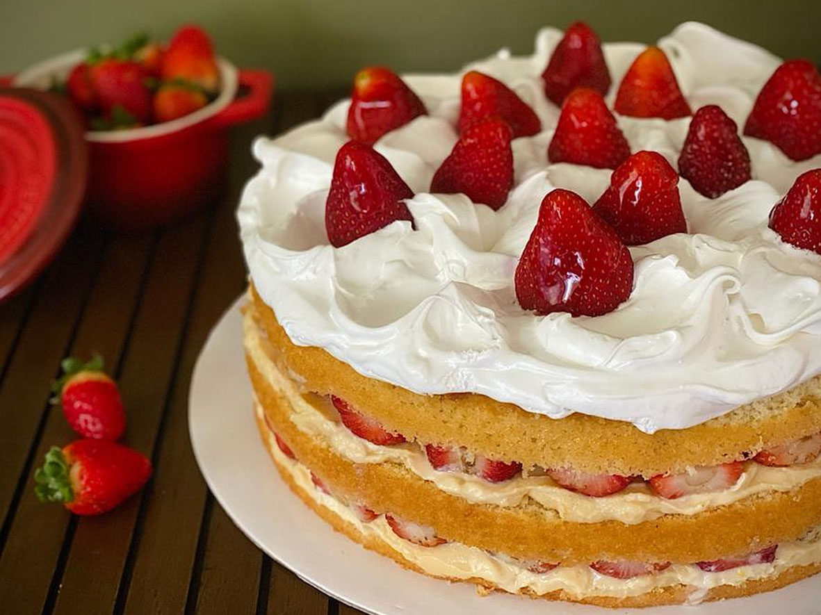 – Torta Deliciosa Naked (R$ 90,00 – 13cm /R$ 160,00 – 20cm /R$ 235,00 – 25cm): bolo branco recheado com creme pâtisserie e morangos e coberta com merengue e morangos.