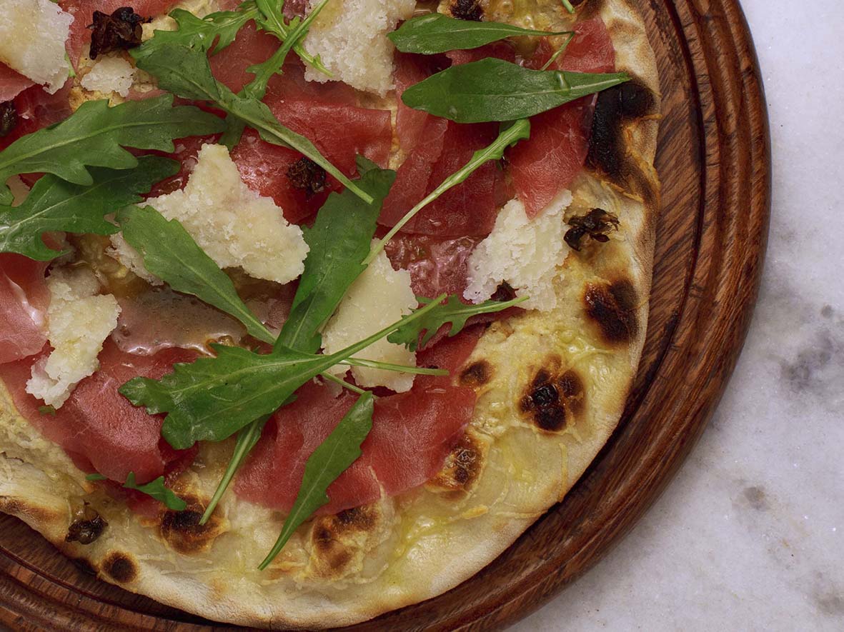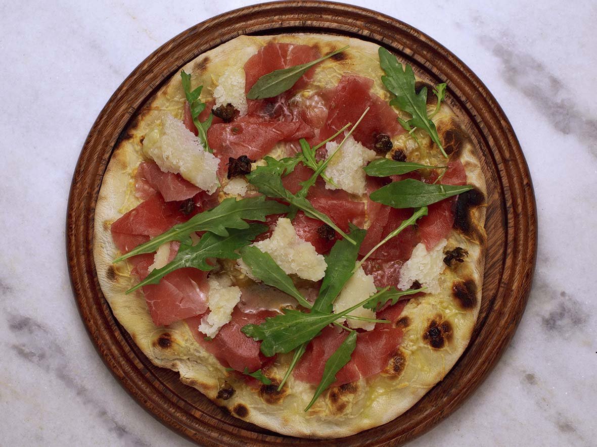 – Stracciatella com parma: muçarela, straciatella, parma, rúcula selvagem e orégano (R$ 109,00).