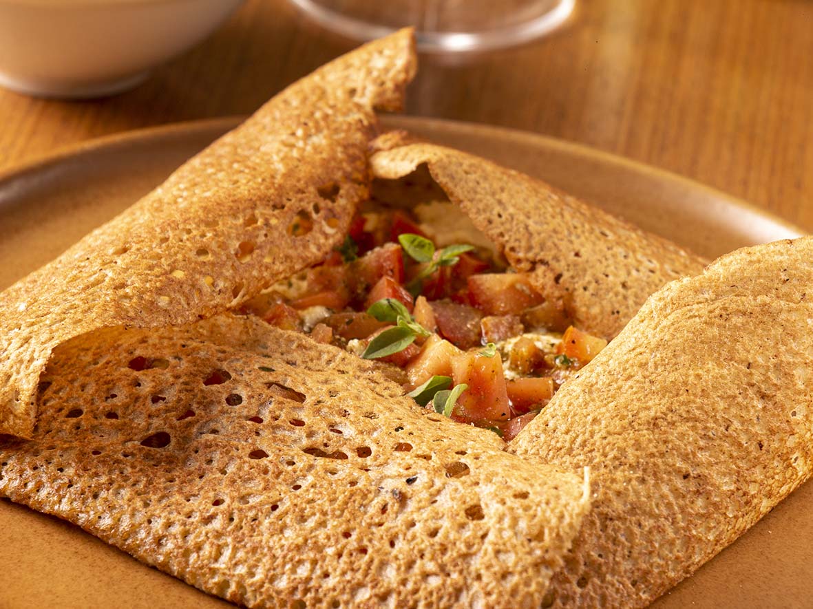 – Galette de queijo de cabra com creme de espinafre e cogumelos Paris grelhados ao vinho branco.