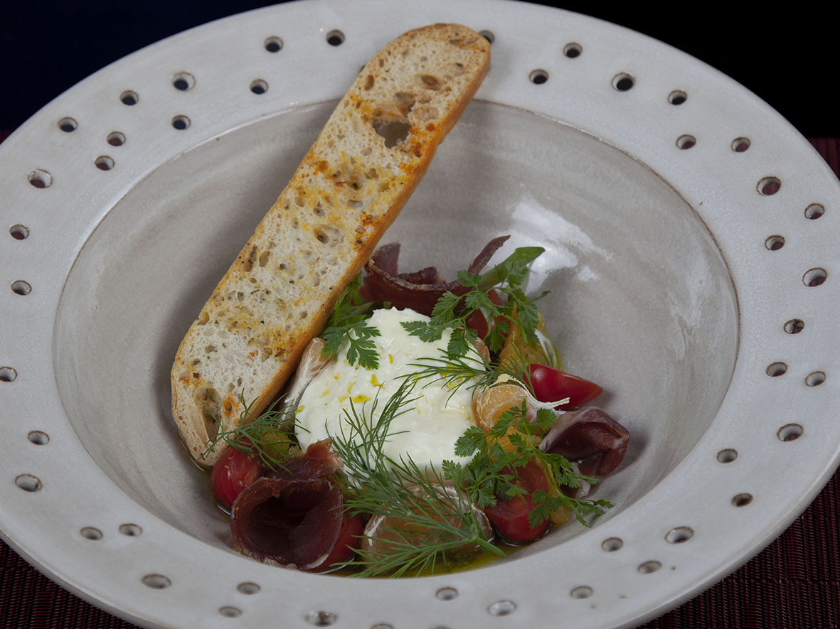 – Burrata Canvas com tomatinho cereja, cítricos e azeite de manjericão.