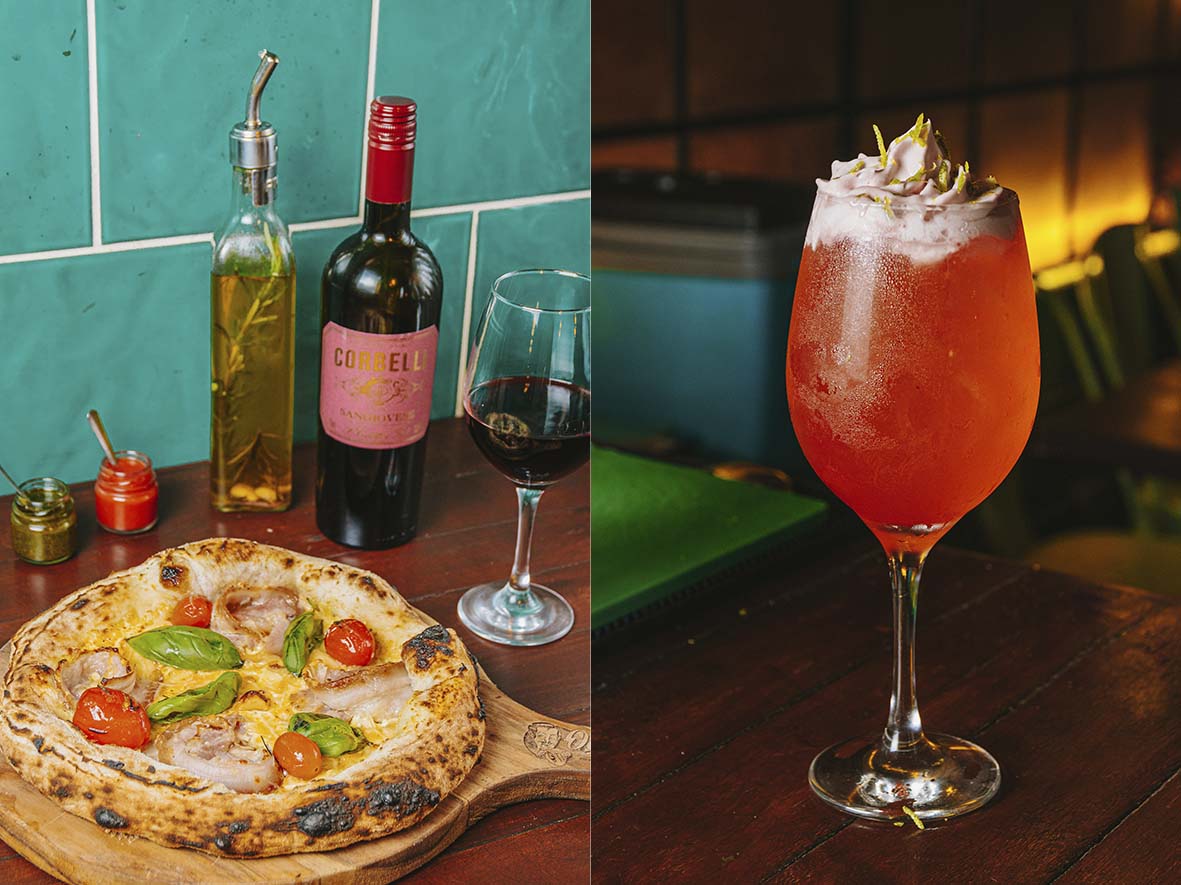 A casa também sugere alguns coquetéis como acompanhamento: Tropical Amalfitana (gin Malibu, abacaxi, pitaya, redução de maracujá, limão e espuma de amora) e Vesúvio (vodca, Aperol, limão, redução de melancia, maracujá, soda, espuma de amora e hortelã), cada um por R$ 33,90.