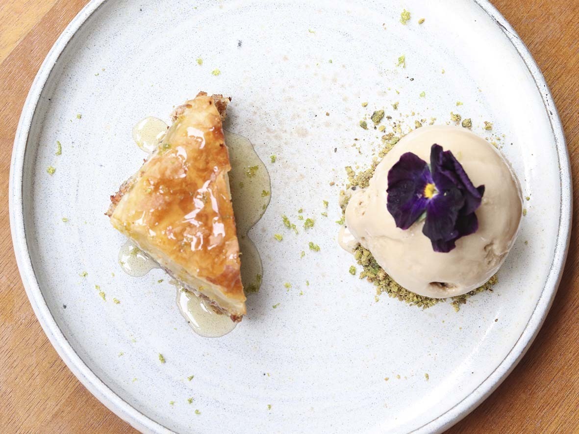– Baklava: massa filo recheada de nozes, calda doce e sorvete de pistache.
