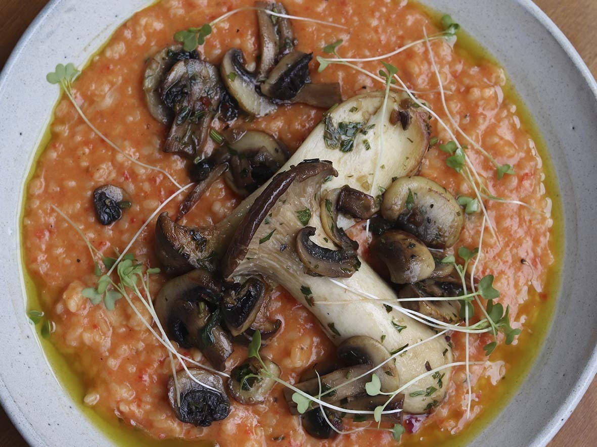 – Youvetsi Chortofágos: cogumelos com risoni de curry cremoso e tomates confitados.