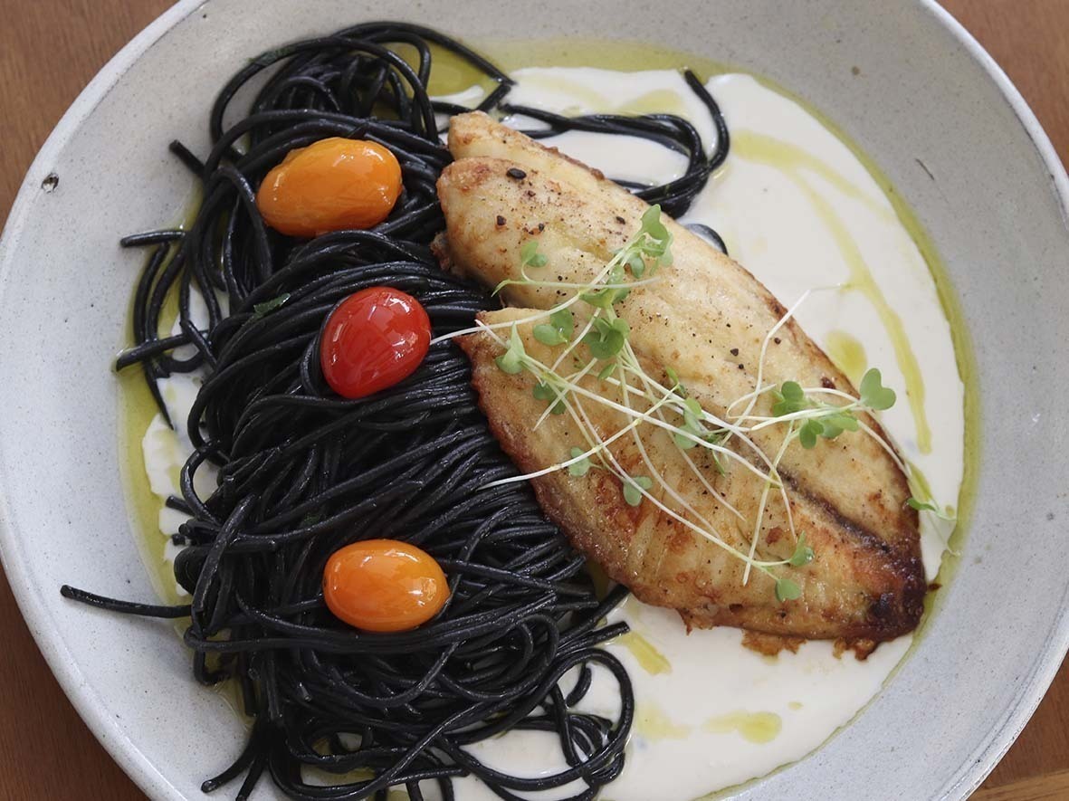 – Peixe St. Peter grelhado com spaghetti nero di seppia e molho limone.