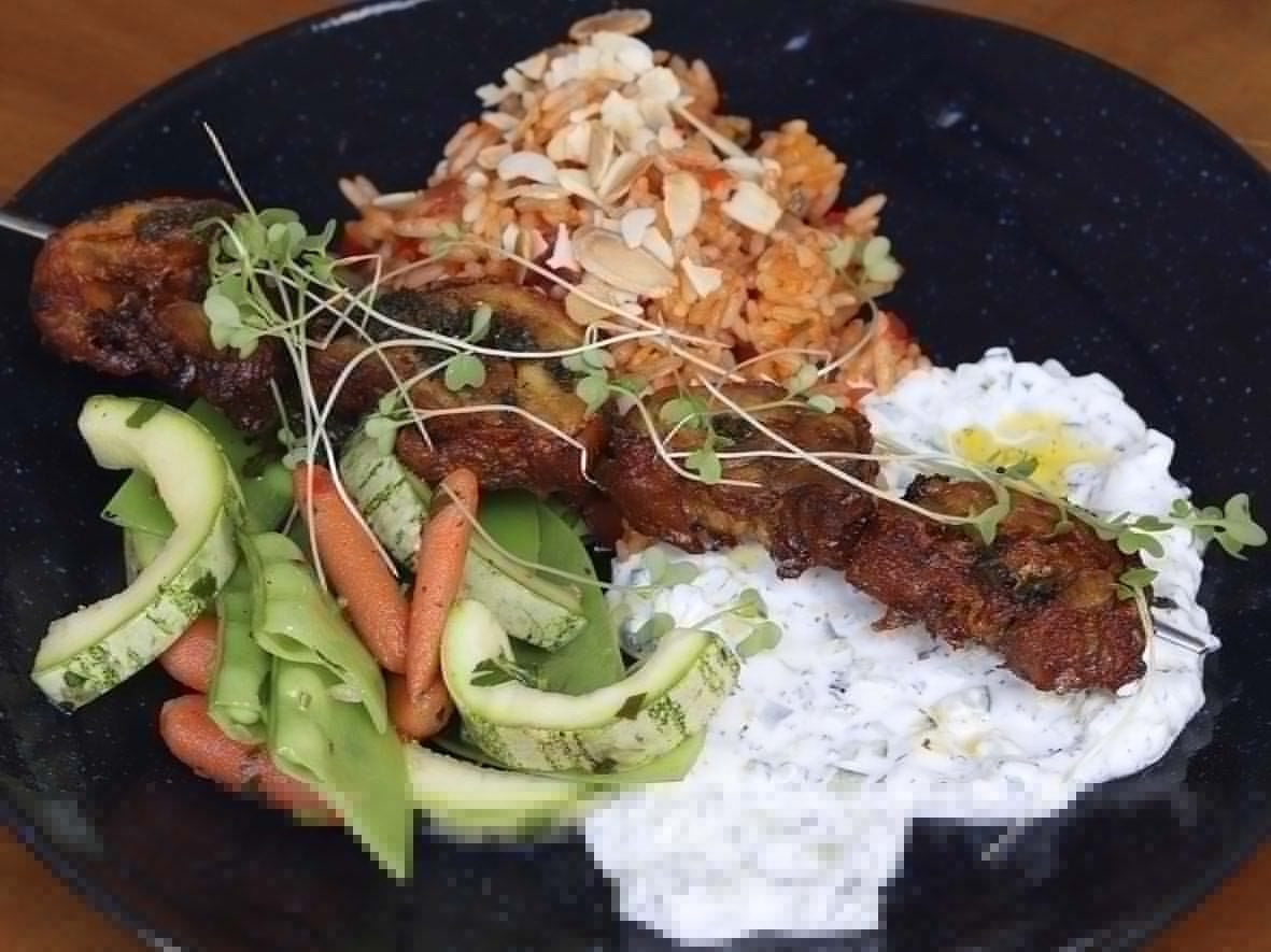 – Souvlaki: espetinho de frango, arroz pilaf, legumes salteados e molho tzatziki.