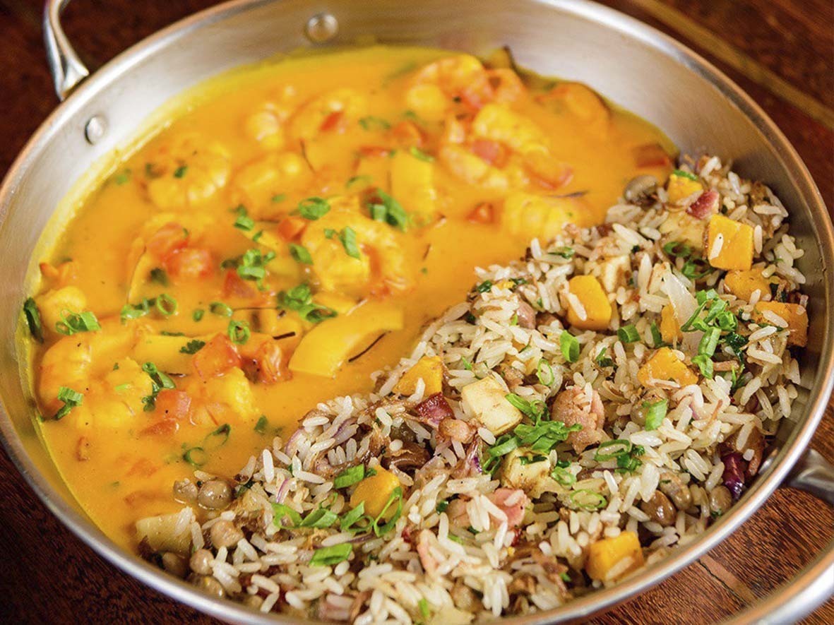 – Camarão Aruba (R$ 128,00 – duas pessoas): camarões salteados na cebola e alho, com molho leve de abóbora, leite de coco, tomate em cubos, lascas de coco, coentro e cebolinha. Acompanha baião de dois com carne seca, bacon, cebola roxa, queijo coalho, pimenta biquinho e nata fresca.