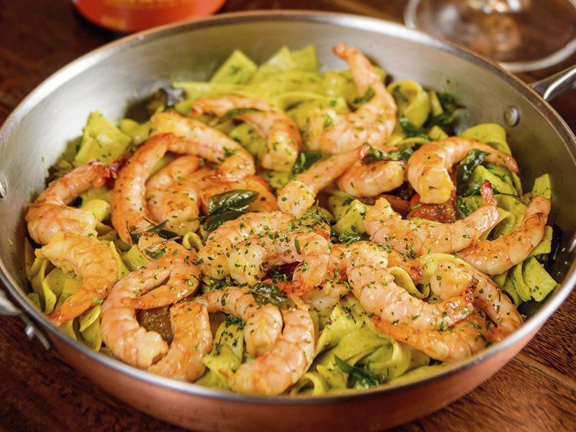 – Camarão Capri (R$ 109,00 – duas pessoas): camarões grelhados envolvidos em fettuccine, berinjela, abobrinha, creme de leite fresco e molho pesto de manjericão.