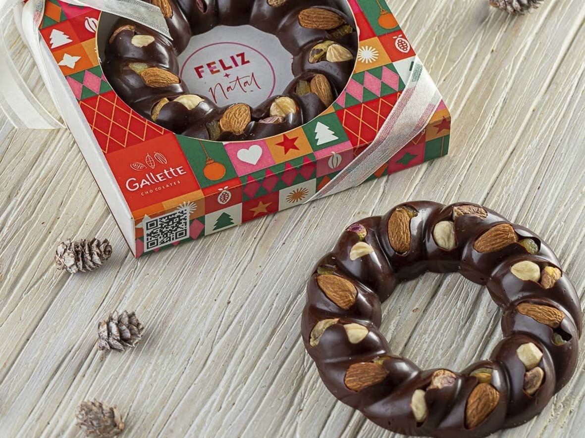 – Guirlandas de Chocolate (R$ 53,20 – 110g) ao leite com nuts, intenso com nuts (chocolate intenso 65% cacau), vegana ao leite de coco e gianduia crocante.