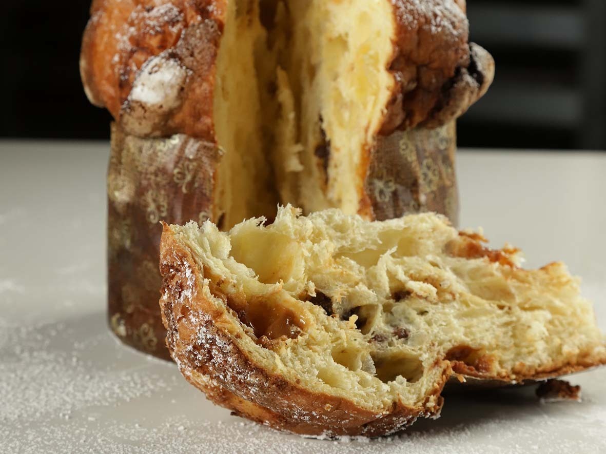 – Panettone de banana cristalizada na casa, caramelo de doce de leite artesanal e canela.